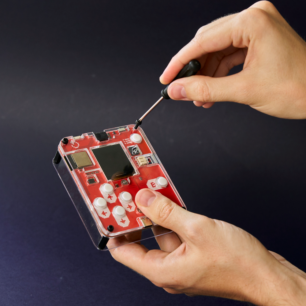- popis komponenata u pakiranju: zaštitni pleksiglas, matična ploča, metalni šarafi (2), USB-C kabel, AA baterije (3), držač baterija, plastični odstojnici (4), plastične kapice za tipkala (7), plastični šarafi (8)