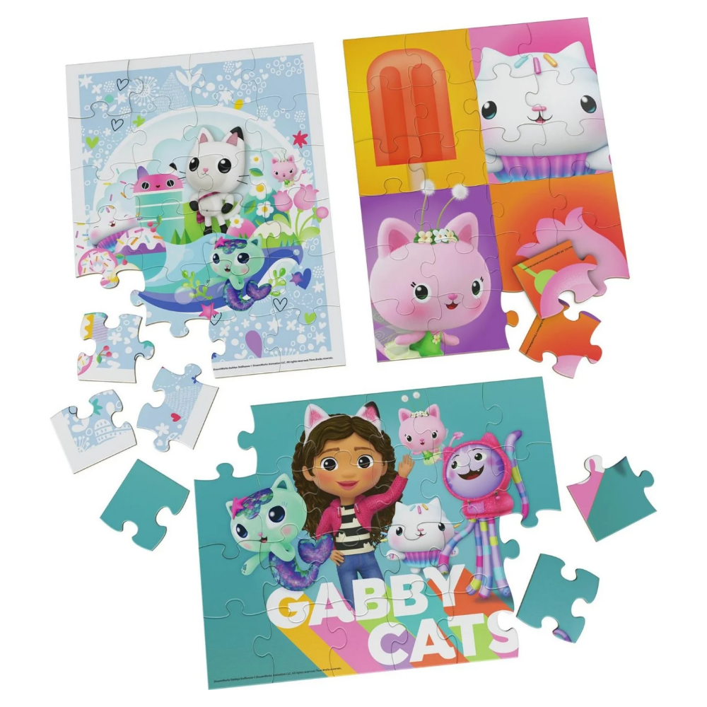 Upotpuni kolekciju Gabby’s Dollhouse igrački s kompletom drvenih puzzli. Kada ih složiš, otkrivaju ti se tri slike s omiljenim likovima. Zbog kvalitete materijala, možeš ih slagati uvijek nanovo i vježbati vještinu spajanja puzzli ili ih staviti u okvir i ukrasiti zidove svoje sobe. Svaka slika sastoji se od 24 komada puzzli, a nalaze se u praktičnom drvenom pakiranju kako bi puzzle uvijek bile na skupu. Iznenadi svoju mačkastičnu prijateljicu s izvrsnim poklonom za djevojčice!