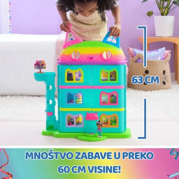 Kuća je ukrašena prepoznatljivim, veselim duginim bojama koje su krasile i Gabbyinu rođendansku proslavu. Unutar kuće visoke čak 63 cm smješteno je šest prostorija te dodatni prostor skriven pod krovom – idealan za posebne zabave! Razigranu maštu dodatno će potaknuti sjajne značajke ovog seta poput legendarnog Cat-A-Vatora – mačjeg dizala kojim Gabby i njezini prijatelji putuju između katova. Osim toga, tu je i toranj za dostavu te čak dva paketića iznenađenja koje možeš otvarati baš kao Gabby u seriji.