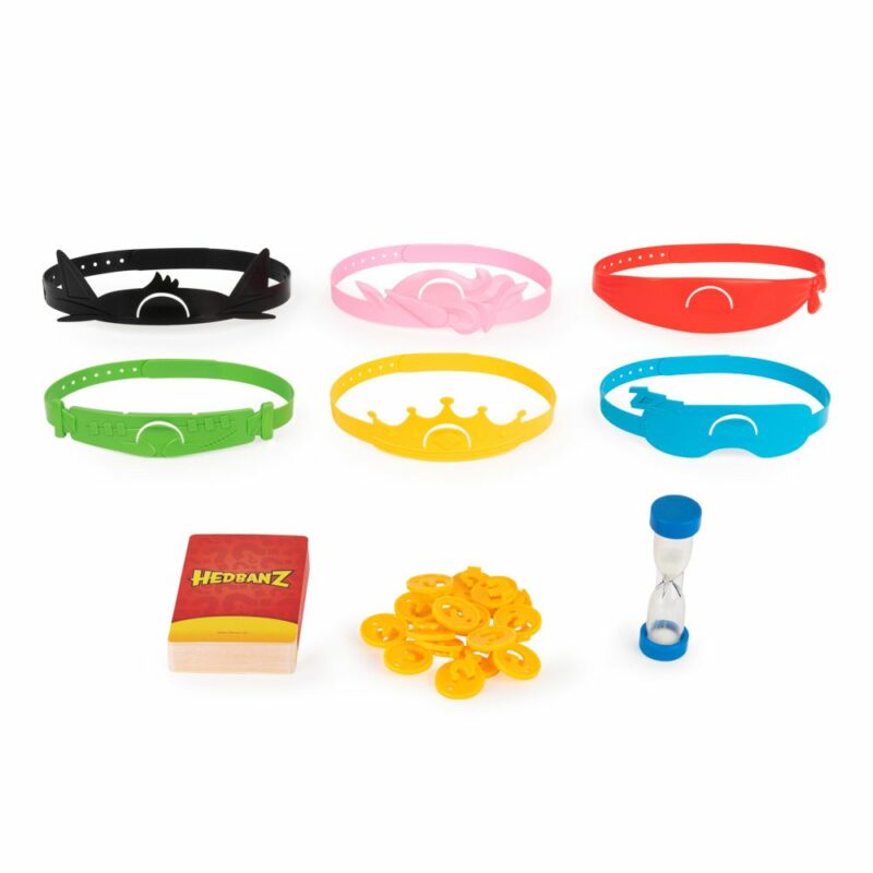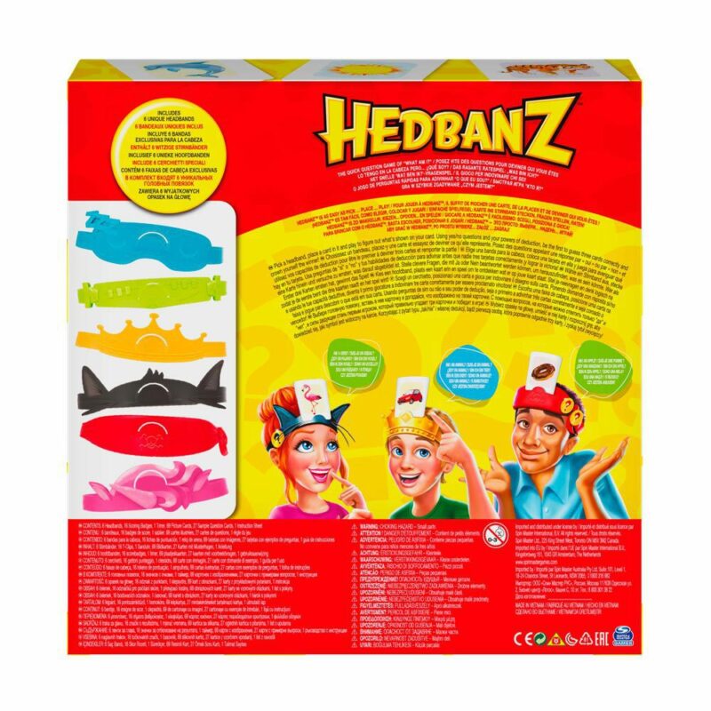 Hedbanz je izvrsna zabava za djecu, roditelje, bake i djedove! Možete provesti cijeli dan i noć igrajući se zajedno! Ovom igrom djeca razvijaju svoju maštu i deduktivne vještine razmišljanja, a pritom se i zabavljaju! Stavi karticu sa slikom na traku za glavu te, kroz pitanja, pokušaj odgonetnuti što je na slici! Pakiranje sadrži: 6 traka za glavu, 16 znački s rezultatima, 1 pješčani sat, 69 slikovnih kartica, 27 oglednih kartica s pitanjima, 1 vodič s uputama.