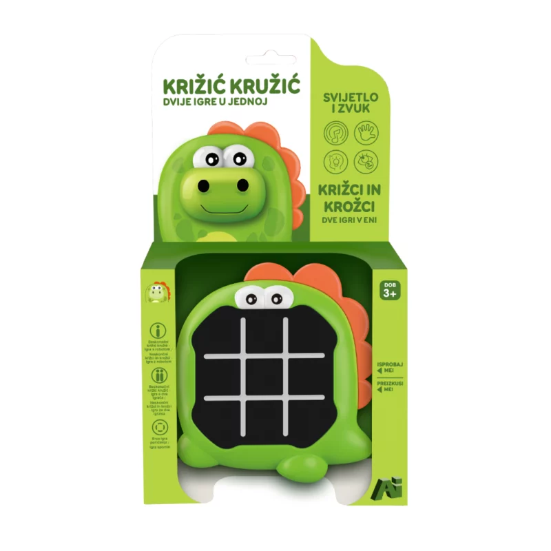 Otkrij modernu verziju klasične igre uz pet simpatičnih likova: kravu, dinosaura, hipa, žirafu i lava. Ove elektronske igre nude dva načina igranja – klasični Križić Kružić s uzbudljivom funkcijom nestajućeg četvrtog znaka te Memory Flash izazov koji potiče koncentraciju i pamćenje. Zahvaljujući praktičnom digitalnom dizajnu, igru možeš igrati samostalno ili u paru, kad god i gdje god poželiš. Uz razigrane životinjske likove, svaki potez postaje zabavniji i jedinstven. Odaberi omiljenog junaka i zaigraj Križić Kružić na potpuno nov način!