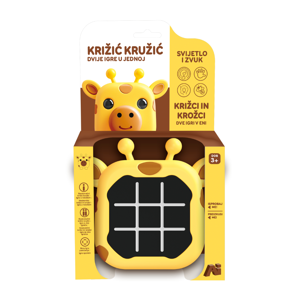 Otkrij modernu verziju klasične igre uz pet simpatičnih likova: kravu, dinosaura, hipa, žirafu i lava. Ove elektronske igre nude dva načina igranja – klasični Križić Kružić s uzbudljivom funkcijom nestajućeg četvrtog znaka te Memory Flash izazov koji potiče koncentraciju i pamćenje. Zahvaljujući praktičnom digitalnom dizajnu, igru možeš igrati samostalno ili u paru, kad god i gdje god poželiš. Uz razigrane životinjske likove, svaki potez postaje zabavniji i jedinstven. Odaberi omiljenog junaka i zaigraj Križić Kružić na potpuno nov način!