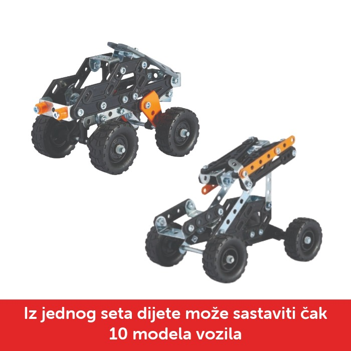 Set sadrži 225 dijelova, 2 alata i knjižicu s uputama pa mali mehaničari u nastanku korak po korak otkrivaju kako spojiti elemente u čvrst i zanimljiv model. Metalna konstrukcija, gumeni kotači i realističan dizajn omogućuju zabavnu igru nakon sastavljanja modela.