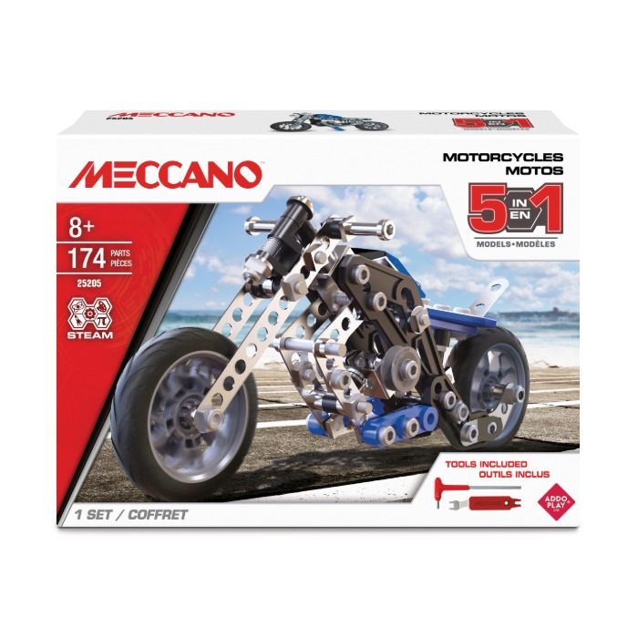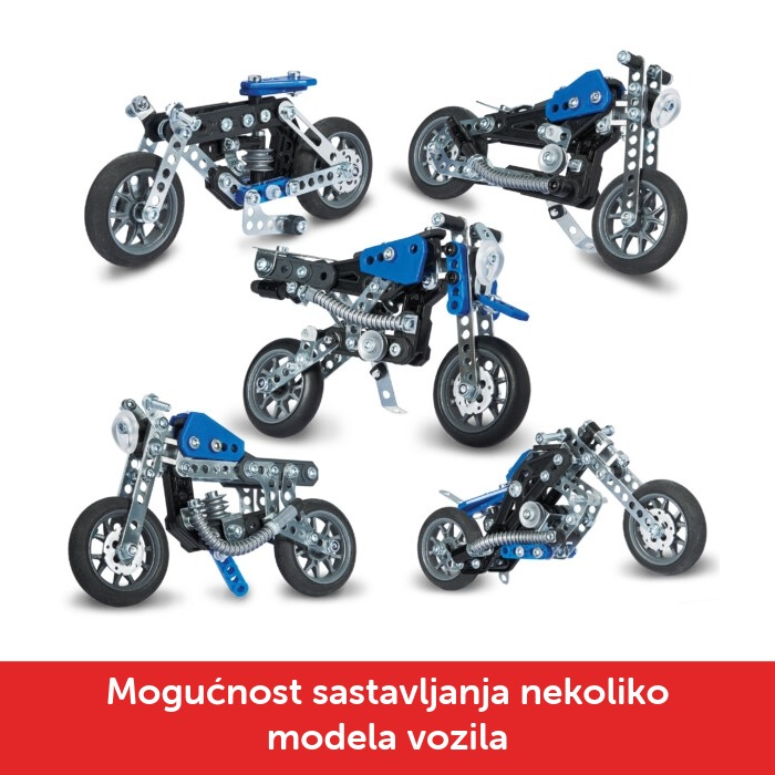 Meccano STEM modularni set omogućuje slaganje čak pet različitih motocikala, od klasičnih dvokotača do modernijih i maštovitijih verzija, pa igra svaki put može krenuti u novom smjeru.