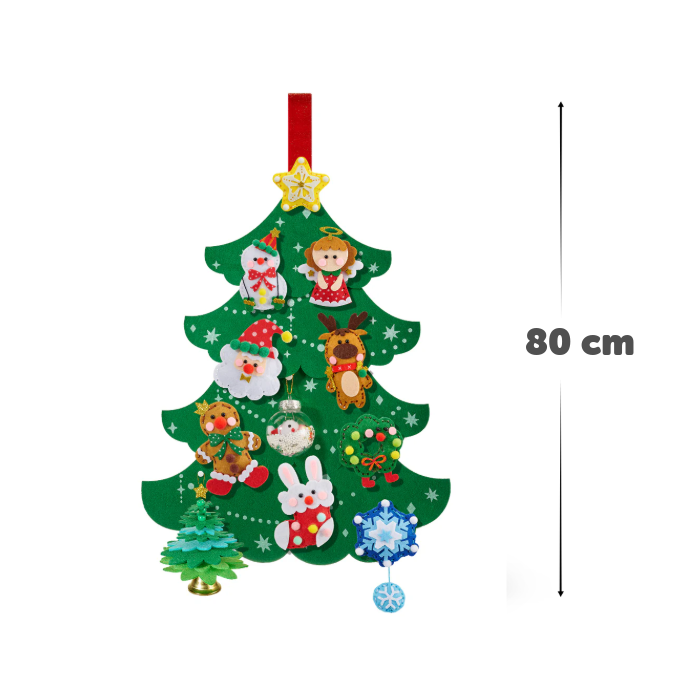 - Sadržaj pakiranja: božićno drvce od filca (visina: 80 cm), 12 paketića s iznenađenjima za izradu blagdanskih ukrasa, materijali i upute za svaki ukras