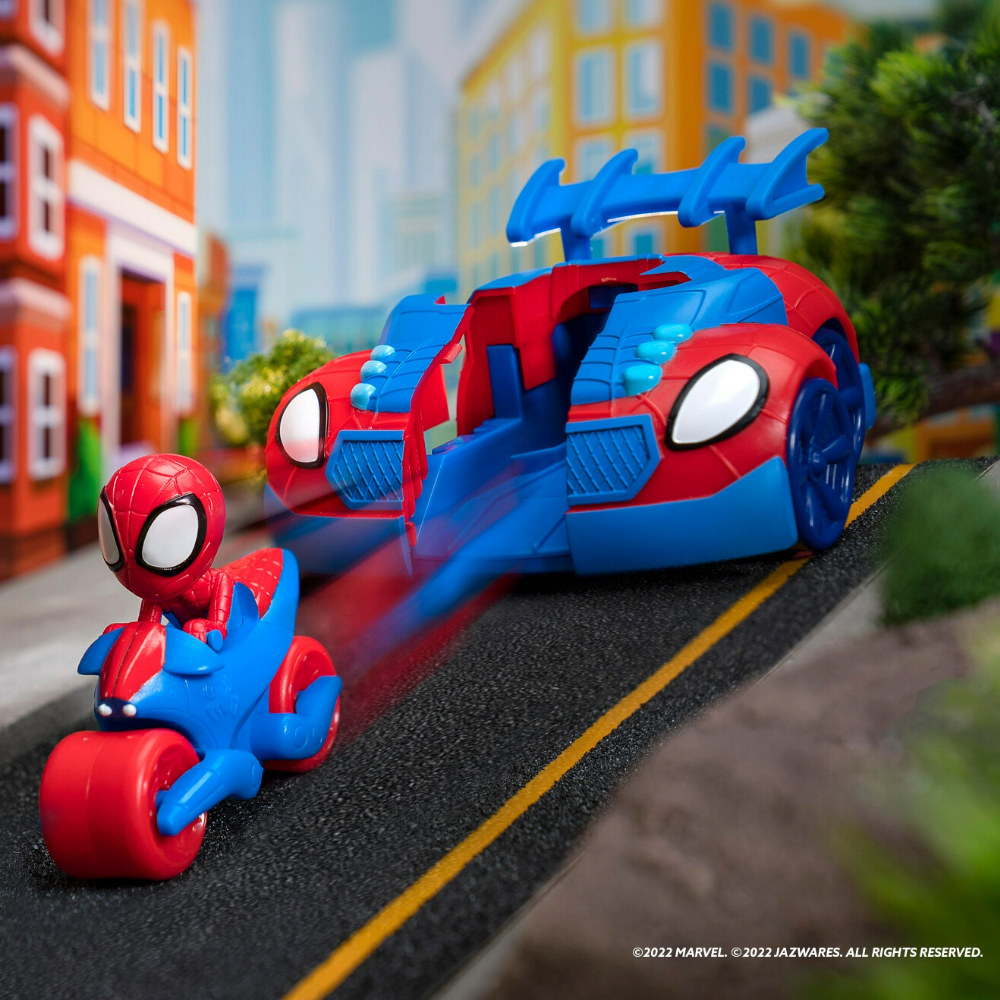 U setu te čeka sportska jurilica s prepoznatljivim Spideyjevim bojama i znakovljem pauka. Ukoliko pritisneš stražnji odbojnik vozila, središnji dio će se otvoriti te u njega možeš spremiti Spideyja i njegov motocikl, a potom ga prema potrebi na terenu i lansirati u akciju.