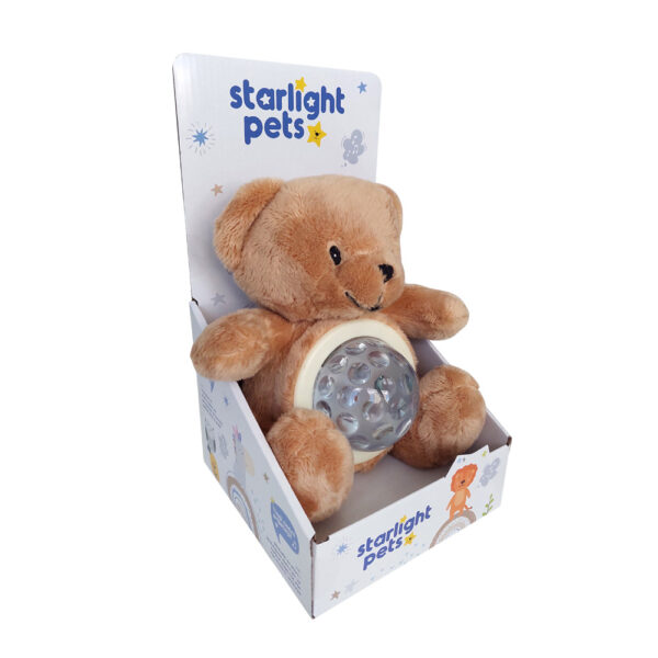 Mekani pliš, čvrsta kristalna svjetleća kugla na trbuhu Starlight Petsa i baterije koje su skrivene u džepiću na leđima plišanca te posebna pažnja sa kojom su napravljeni izvrsni su razlozi zbog kojih će ova nježna igračka postati dražestan dio svakodnevne rutine vašega djeteta i najdraži plišani prijatelj za laku noć!